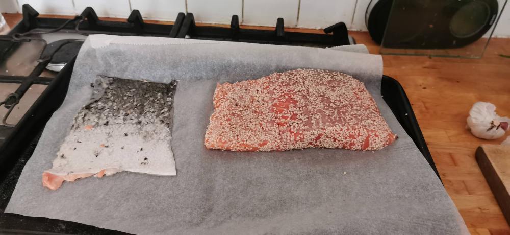 - Pat the salmon dry with paper towels and lay onto a tray lined with baking paper.Season with salt and pepper then coat with sesame seeds
