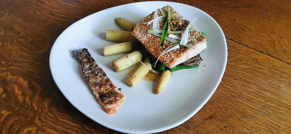 - Layer the veg onto the plate top with noodles and lay salmon over the noodles.